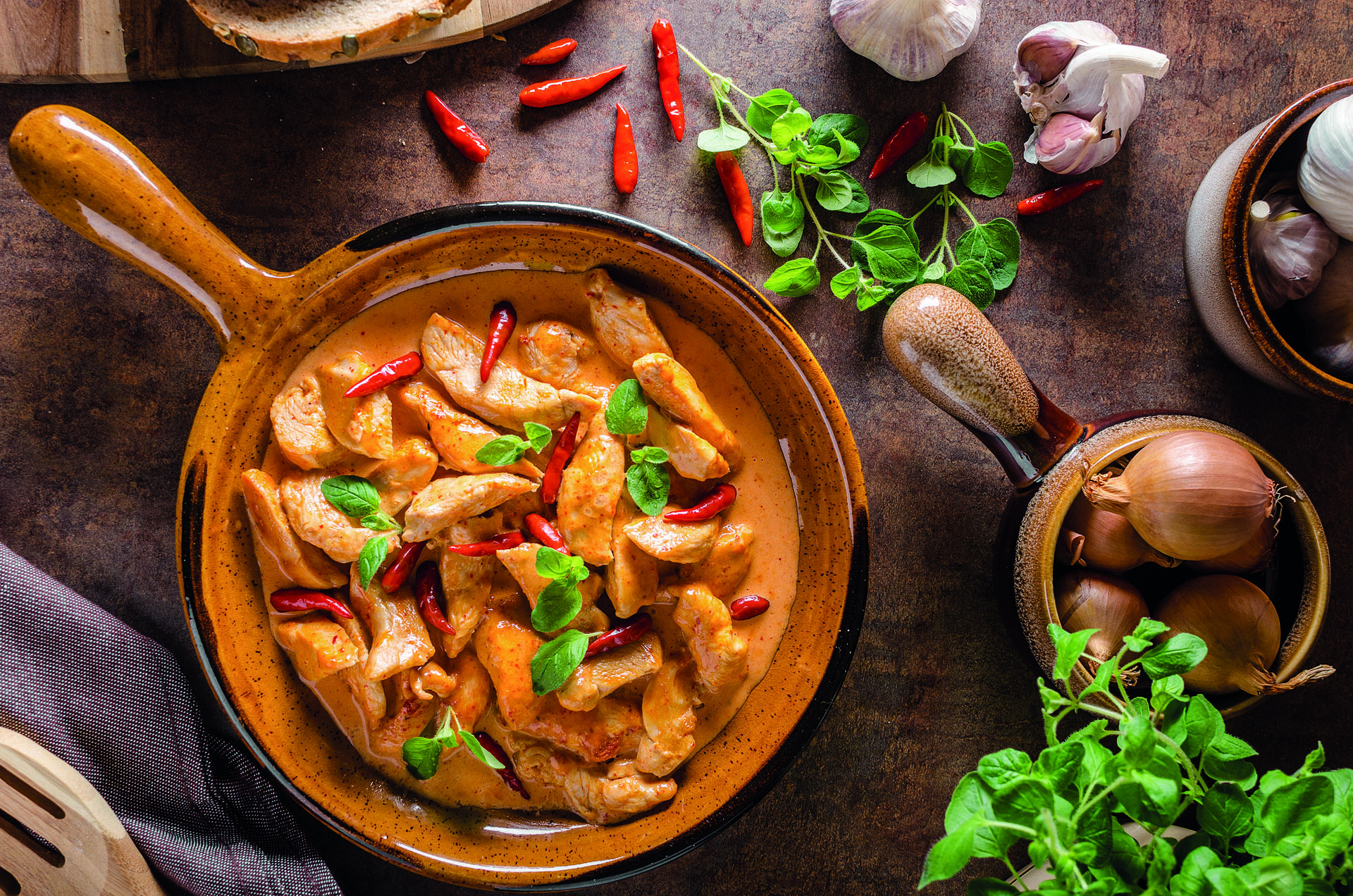 Στη συνέχεια προσθέτετε το ψιλοκομμένο σκόρδο και τις πιπεριές κομμένες ζουλιέν, σοτάρετε για άλλα 3-4 λεπτά. Προσθέτετε τον πελτέ ντομάτας, τον ζωμό, τον χυμό λεμονιού, την πάπρικα και το καγιέν, σβήνετε με το κρασί. Σερβίρετε με το τηγάνι και πασπαλίζετε με ψιλοκομμένο σχοινόπρασο.