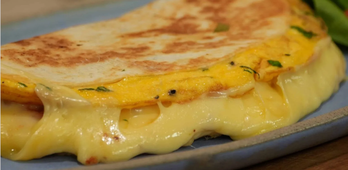 Στην μισή ομελέτα βάζουμε 4 φέτες τυρί και διπλώνουμε. Αφήνουμε για λίγο να λιώσει το τυρί. Σερβίρουμε με φρέσκια σαλάτα.