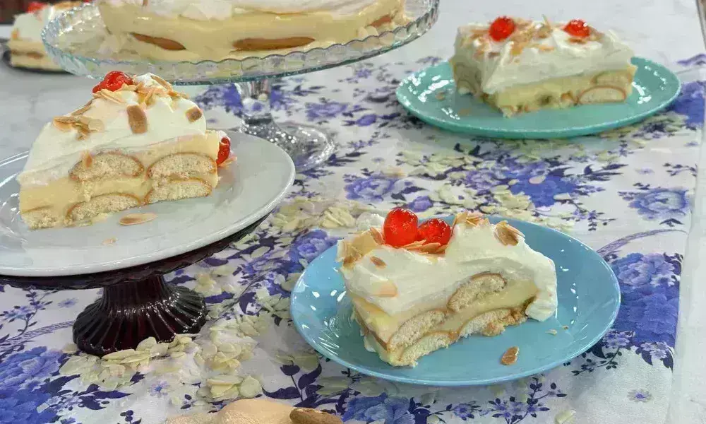Για το στήσιμο: Βουτάμε τα μπισκότα ένα ένα στο γάλα με το λικέρ και στρώνουμε σε μια φόρμα αποσπώμενη στρογγυλή στην βάση μπισκότα. Από πάνω βάζουμε την κρέμα και στη συνέχεια άλλη μια στρώση μπισκότα. Έπειτα την υπόλοιπη κρέμα. Έπειτα βάζουμε στο ψυγείο για 3 ώρες. Στη συνέχεια χτυπάμε τη και την προσθέτουμε στο γλυκό, γαρνίρουμε με αμύγδαλα.