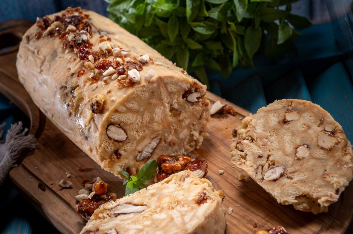 Αφήνουμε για πολύ λίγο και κρυώσει και προσθέτουμε τα μπισκότα σπασμένα και τους καραμελωμένους ξηρούς καρπούς. Ανακατεύουμε να πάει παντού. Απλώνουμε το μείγμα σε λαδόκολλα και σχηματίζουμε ρολό. Τυλίγουμε πολύ καλά και βάζουμε στο ψυγείο για τουλάχιστον 3 ώρες. Αφού σφίξει, αφαιρούμε τη λαδόκολλα, κόβουμε σε φέτες και σερβίρουμε.