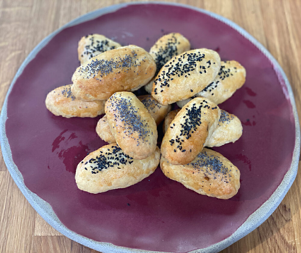 Πασπαλίζουμε με μαυροσίσαμο ή γλυκάνισο. Ψήνουμε σε προθερμασμένο φούρνο στους 150°C στον αέρα, στη μεσαία σχάρα, περίπου 25-30 λεπτά μέχρι να φουσκώσουν και να ροδίσουν. Μπορείς να τα έχεις έτοιμα γεμισμένα στην κατάψυξη και να τα ψήσεις τελευταία στιγμή. Είναι φανταστικά.