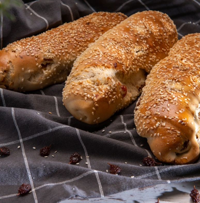 Σκεπάζουμε τη ζύμη με μεμβράνη και αφήνουμε στην άκρη να φουσκώσει. Σουρώνουμε τις σταφίδες και, αφού έχει φουσκώσει το ζυμάρι, ρίχνουμε μέσα και ζυμώνουμε. Χωρίζουμε τη ζύμη σε 12 μέρη και πλάθουμε σε μπάλες. Λαδώνουμε απαλά ένα ταψάκι και τοποθετούμε τη μία μπάλα δίπλα στην άλλη. Αφήνουμε ξανά τα σταφιδόψωμα να φουσκώσουν. Τέλος, αλείφουμε με ένα πινέλο όλη την επιφάνεια μεγάλα και πασπαλίζουμε με σουσάμι. Ψήνουμε σε προθερμασμένο φούρνο στους 200 βαθμούς για περίπου 25-30 λεπτά. Βγάζουμε από το φούρνο αφήνουμε να κρυώσουν και σερβίρουμε.