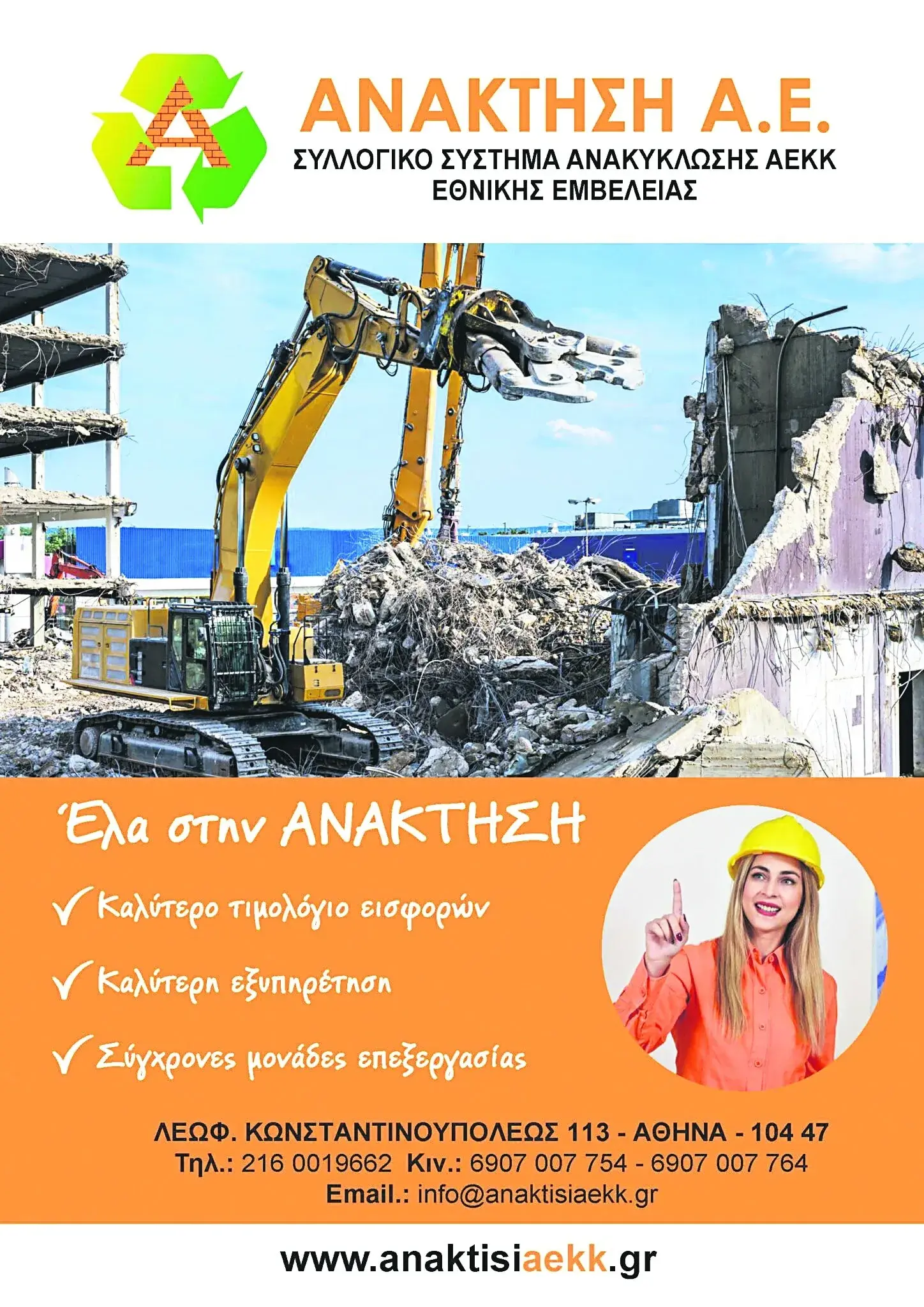 Το Συλλογικό Σύστημα Εναλλακτικής Διαχείρισης Αποβλήτων Εκσκαφών, Κατεδαφίσεων και Κατασκευών ΑΝΑΚΤΗΣΗ Α.Ε., με έδρα την Αττική και εθνική εμβέλεια, έχει λάβει έγκριση από τον Ελληνικό Οργανισμό Ανακύκλωσης με ΑΔΑ: 96ΠΓ46Ψ8ΟΖ-ΥΕΖ και έχει μετόχους έμπειρους διαχειριστές ΑΕΚΚ, ενώ συνεργάζεται με μονάδες επεξεργασίας ΑΕΚΚ που διαθέτουν όλες τις νόμιμες άδειες. H λειτουργία της εταιρίας και των συνεργατών της εναρμονίζεται με την εθνική νομοθεσία (Ν. 4819/21) για την ανακύκλωση και την ΚΥΑ 36259/1757/Ε103 (ΦΕΚ 1312, 24/8/2010).