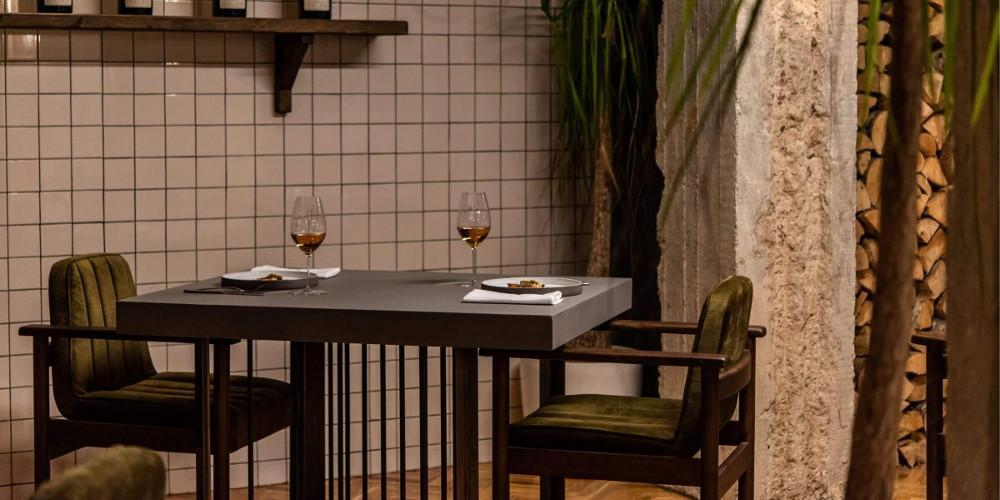Ανοίγοντας τη μεταλλική πόρτα με το ειδικό κλειδί, ξεπροβάλλει ένας industrial χώρος με αναφορές από τα 70s και old school αισθητική. Κολόνες από τσιμέντο, λευκά πλακάκια, ένα ψυγείο ωρίμανσης κρεάτων, στoιβαγμένα ξύλα και μια ιδιότυπη κάβα πλαισιώνουν τα λιγοστά τραπέζια του εστιατορίου, ενώ πίσω από τη μεγάλη τζαμαρία με τον μεταλλικό σκελετό δεσπόζει η ανοιχτή κουζίνα από όπου διαχέεται μια προκλητική καπνιστή μυρωδιά… Στο εσωτερικό της πρωταγωνιστούν οι σχάρες και οι ανοιχτές φωτιές, αφού όλα ψήνονται στο ξύλο, ενώ το καπνιστήριο και η sous vide τεχνολογία μαρτυρούν την αδυναμία του chef στις δημιουργικές τεχνικές.