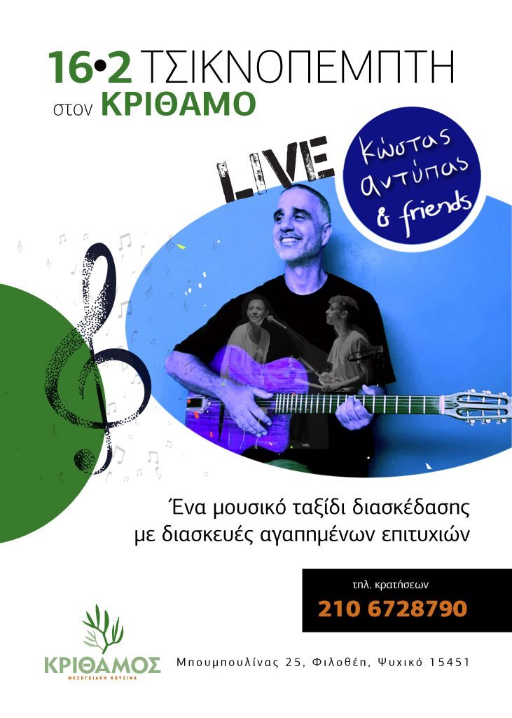 Ο τραγουδοποιός Κώστας Αντύπας και τη μπάντα του θα εμφανιστούν στον φιλόξενο χώρο του ΚΡΙΘΑΜΟΣ για μια ξεχωριστή συναυλιακή βραδιά. Με ένα μουσικό πρόγραμμα που περιλαμβάνει διασκευές και μοναδικές εκτελέσεις αγαπημένων τραγουδιών αλλά και κομμάτια της δικής του δισκογραφίας, προκαλεί το κοινό του να συμμετάσχει σε ένα μουσικό ταξίδι διασκέδασης.