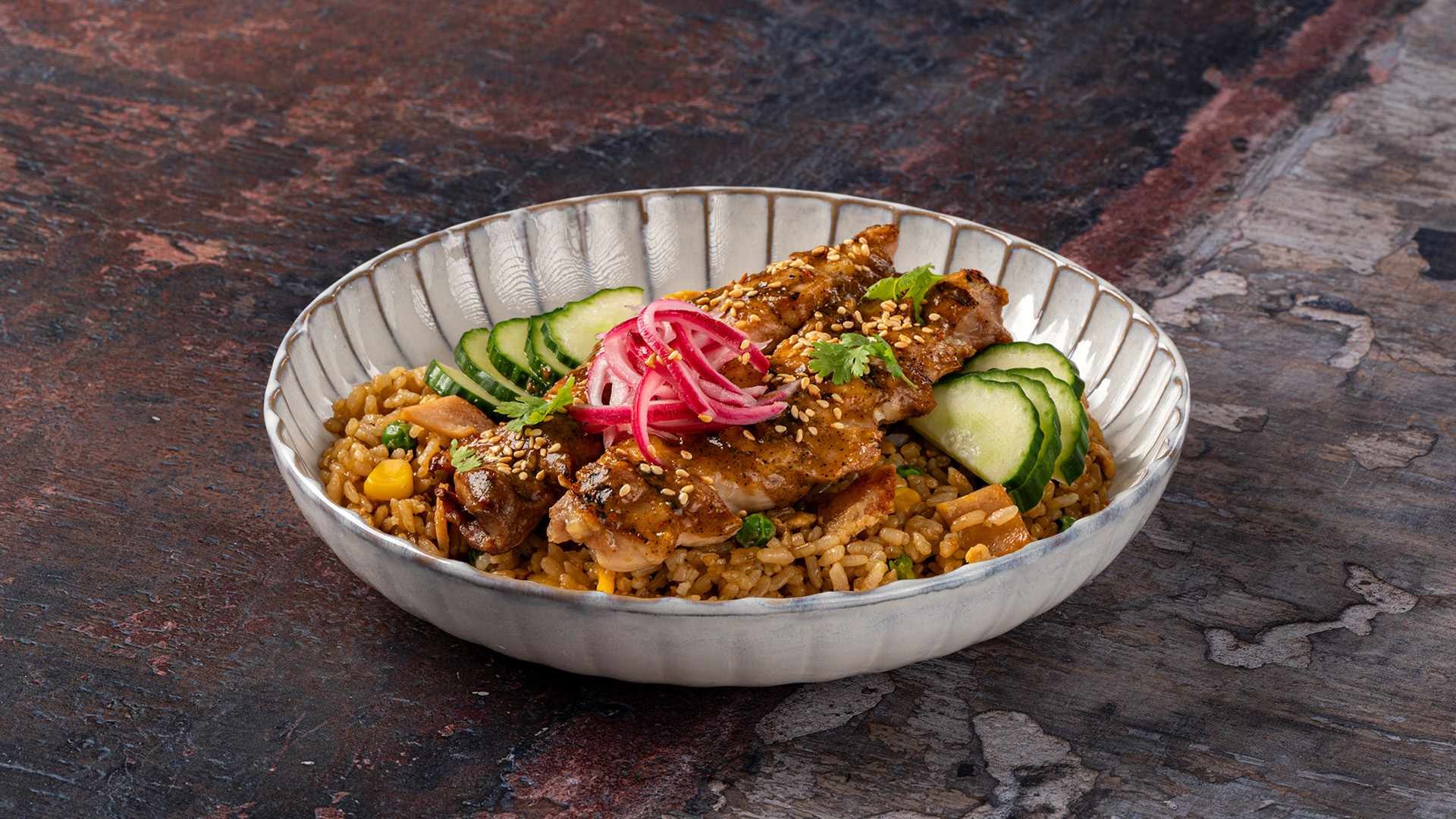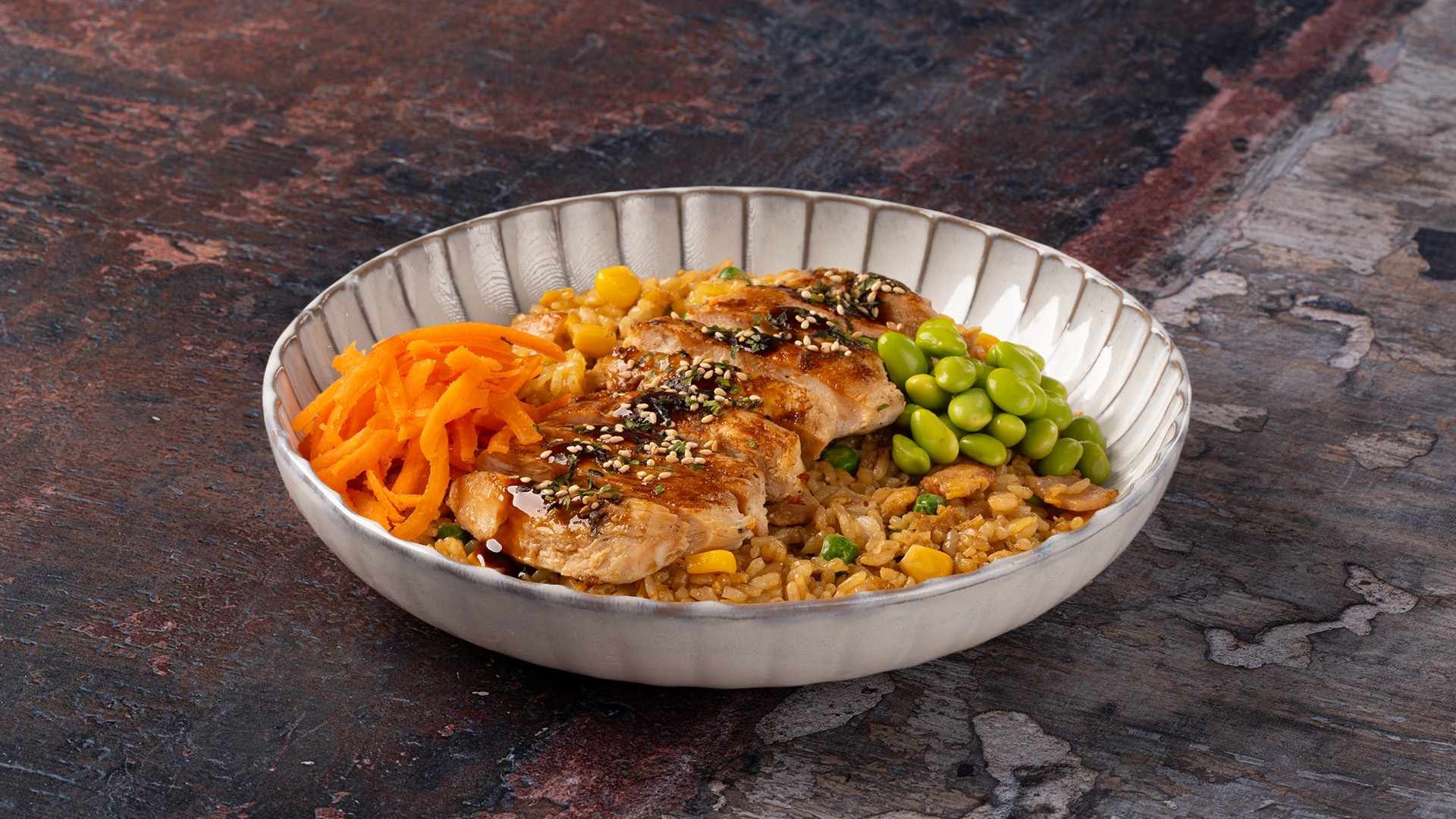 Ψητό φιλέτο κοτόπουλο με τηγανητό ρύζι ατμού, teriyaki sauce, edamame, καρότο και furikake.