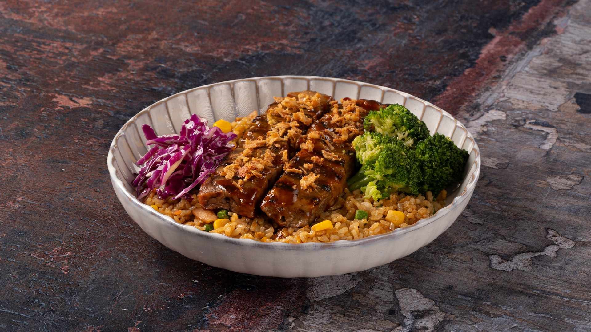 Δύο καλαμάκια χοιρινά με τηγανητό ρύζι ατμού, asian BBQ, κόκκινο λάχανο, crispy onion και μπρόκολο.