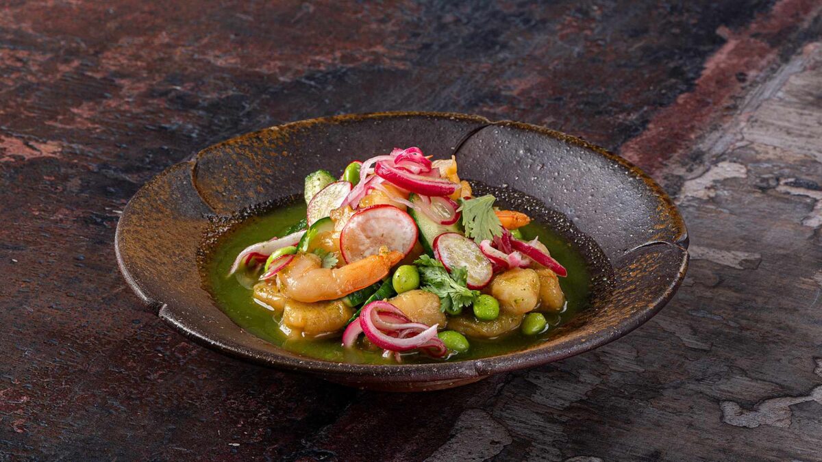 Μαριναρισμένες γαρίδες με amazu ponzu, Αquachile, edamame, πίκλα ραπανάκι & κρεμμύδι, αγγούρι και lemon zest.