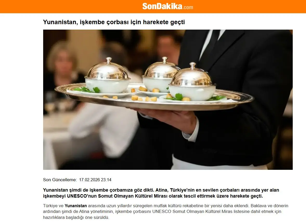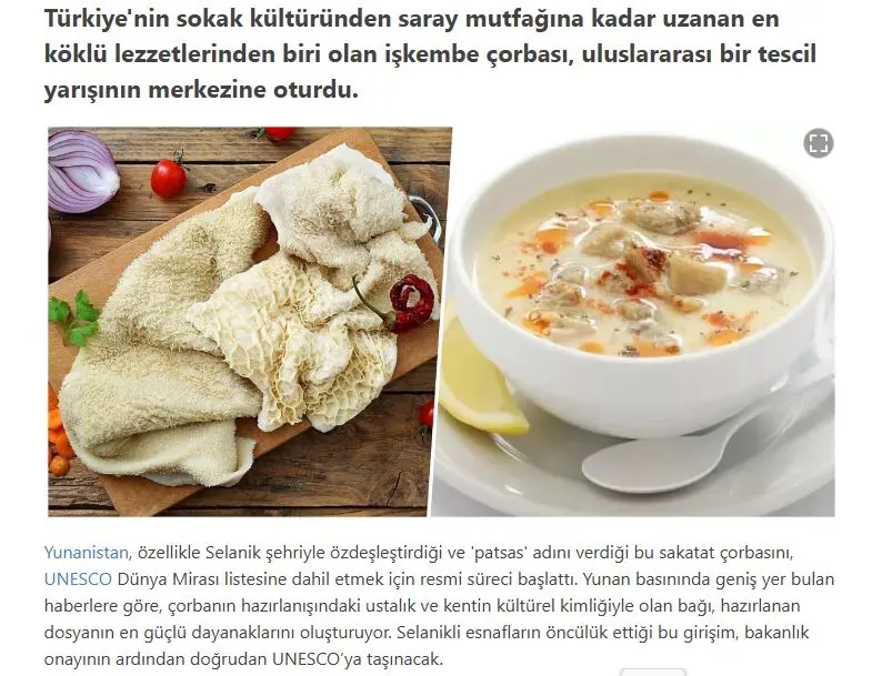 Σε άρθρο με τίτλο «Η Ελλάδα ξεκινά πρωτοβουλία για την άυλη πολιτιστική κληρονομιά του πατσά», η Habertürk σημειώνει ότι η Ελλάδα «ετοιμάζεται να συμπεριλάβει τη σούπα από πατσά, ένα πιάτο που καταναλώνεται στην Τουρκία εδώ και αιώνες, στον κατάλογο Άυλης Πολιτιστικής Κληρονομιάς της UNESCO».