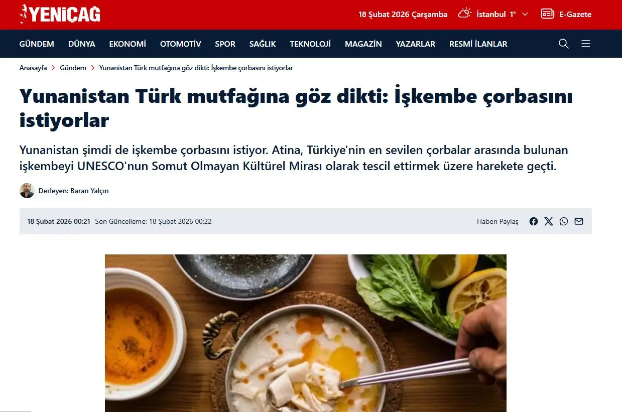 Πιο έντονους τόνους υιοθέτησε η εθνικιστική εφημερίδα Yeniçağ, που δημοσίευσε άρθρο με τίτλο: «Η Ελλάδα έχει βάλει στο μάτι την τουρκική κουζίνα – Θέλουν να μας πάρουν τον πατσά». Το δημοσίευμα επικαλείται εκπροσώπους της τουρκικής γαστρονομίας που δηλώνουν ότι η σούπα έχει βαθύτερες ρίζες στην Τουρκία λόγω των μεθόδων παρασκευής και των τελετουργικών σερβιρίσματος, ενώ υπογραμμίζει ότι ο πατσάς αποτελεί θεμέλιο της τουρκικής νυχτερινής κουλτούρας.