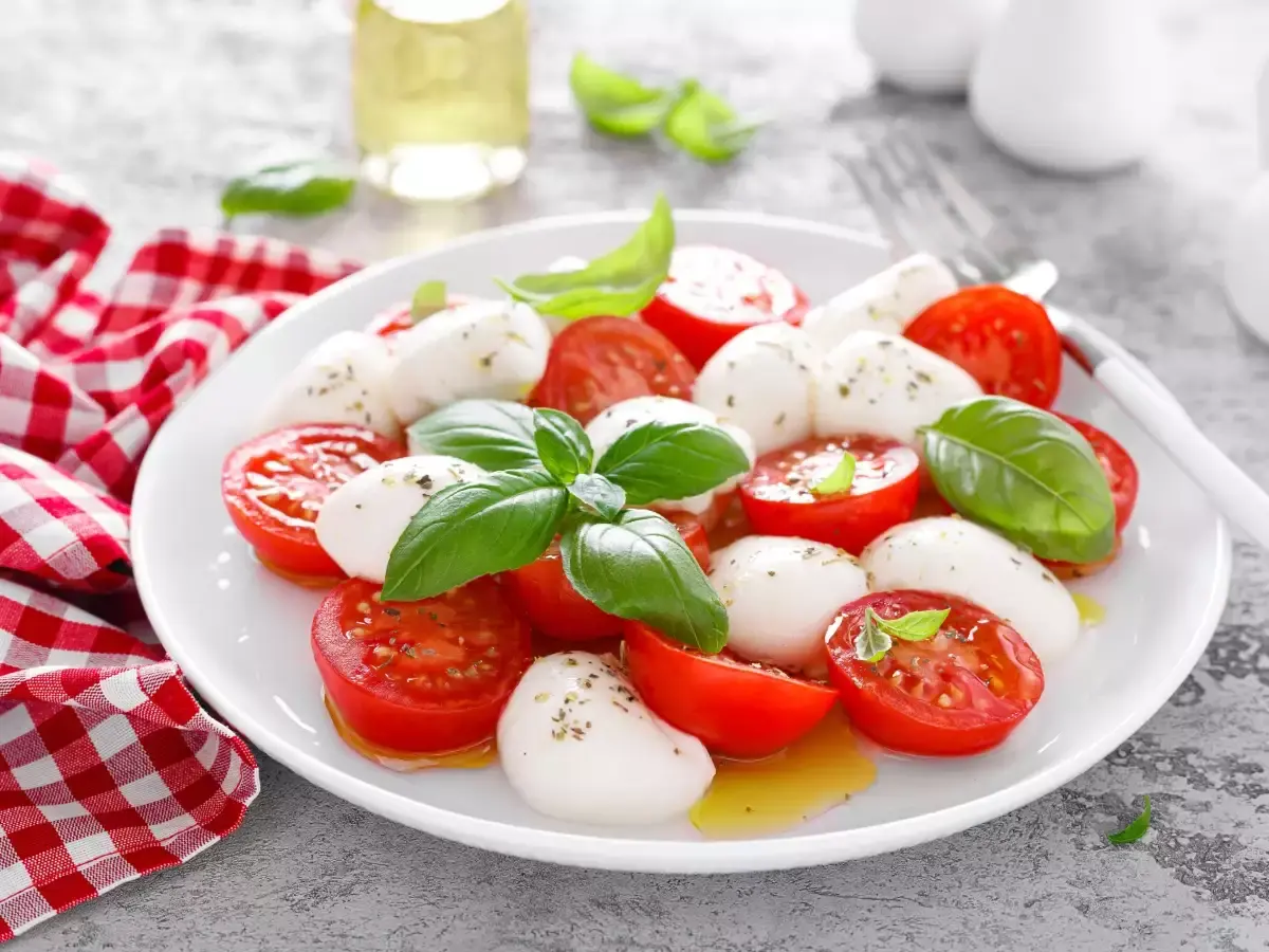 Σερβίρουμε σε ένα φαρδύ πιάτο, εναλλάσσοντας τις ροδέλες ντομάτας με τις φέτες μοτσαρέλας.