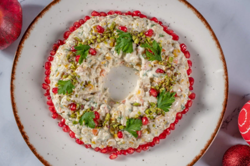 Βάζουμε την σαλάτα σε μια λαδωμένη φόρμα κέικ και ξεφορμάρουμε σε μια πιατέλα. Μπορούμε να στολίσουμε πάνω με θρυμματισμένο φιστίκι και ρόδι.