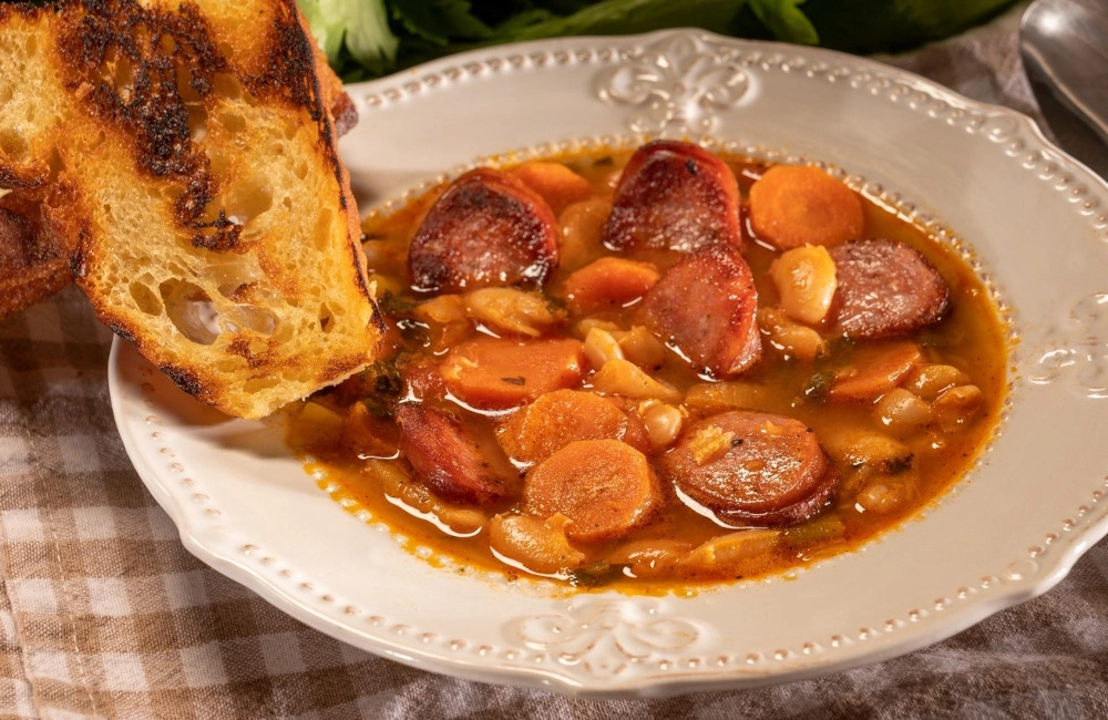Στη συνέχεια σουρώνουμε και κρατάμε δύο κούπες από το ζωμό. Στην ίδια κατσαρόλα ζεσταίνουμε το ελαιόλαδο και σοτάρουμε τα λουκάνικα κομμένα σε φέτες.