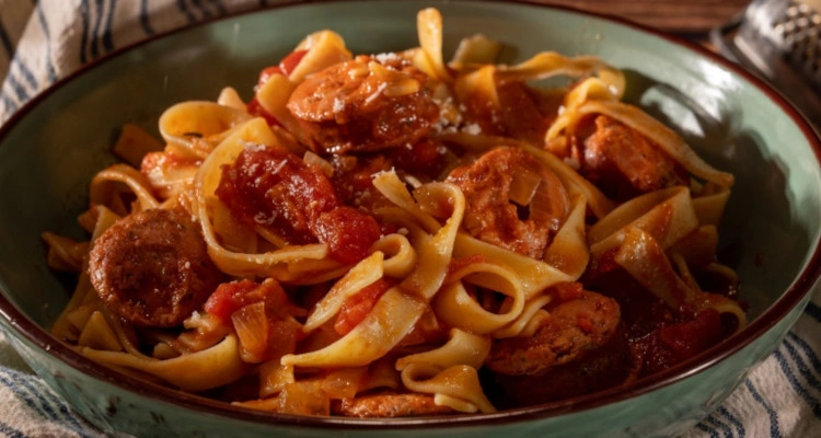 Σε ένα βαθύ τηγάνι ζεστάνουμε το ελαιόλαδο και ψήνουμε τα λουκάνικα μέχρι να ροδίσουν. Προσθέτουμε το κρεμμύδι και το σκόρδο και σοτάρουμε για 2 λεπτά.