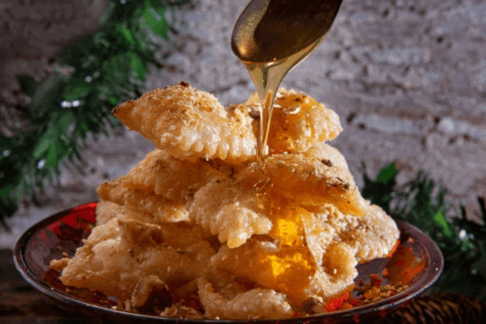 Τηγανίζουμε σε αρκετό καυτό ελαιόλαδο μέχρι να ροδίσουν και από τις δύο πλευρές. Βγάζουμε σε απορροφητικό χαρτί και αφήνουμε να στραγγίξουν. Όταν κρυώσουν μεταφέρουμε σε μία πιατέλα. Ζεσταίνουμε ελάχιστα το μέλι με δύο κουταλιές νερό ώστε να γίνει πιο υγρό.