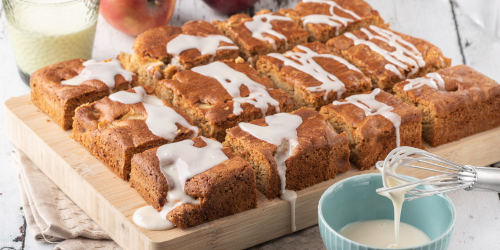 Αφαιρούμε τον κάδο από το μίξερ, προσθέτουμε το μείγμα με τα μήλα και ανακατεύουμε καλά με μια σπάτουλα ζαχαροπλαστικής. Απλώνουμε το μείγμα ομοιόμορφα σε μια ορθογώνια φόρμα, διαστάσεων 33×22 εκ., που έχουμε στρώσει με λαδόκολλα. Ψήνουμε για 30-35 λεπτά.
