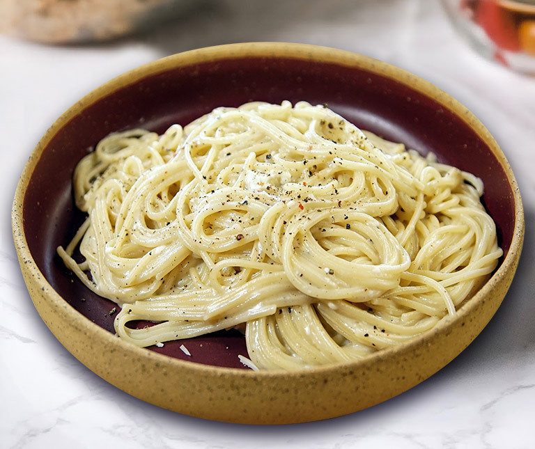 Σε αυτή τη φάση γύρω από τα μακαρόνια έχει δημιουργηθεί κρεμώδης σάλτσα τυριού. Σερβίρουμε αμέσως στάζοντας σταγόνες ελαιόλαδο κι έξτρα πιπέρι.