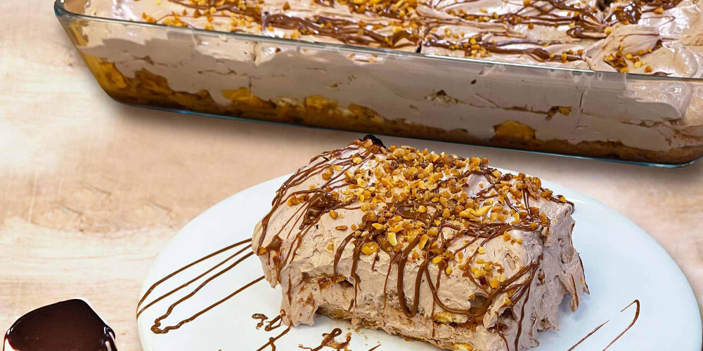 Σπάμε τα μπισκότα σε χοντρά κομμάτια. Σε ταψί 30×25 ή κοντινό μέγεθος, κάνουμε μία στρώση τα μισά σπασμένα μπισκότα. Τα ραντίζουμε με το μισό σοκολατούχο γάλα. Απλώνουμε τη μισή κρέμα.