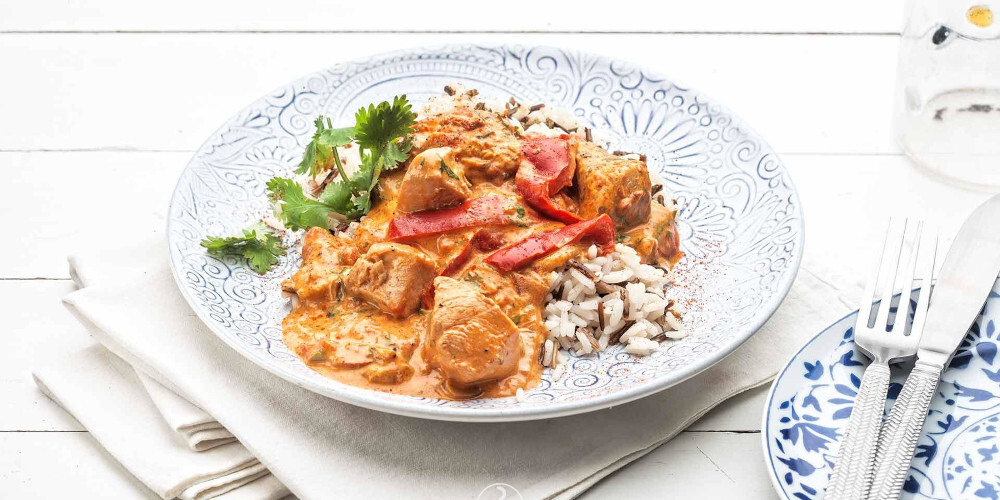- Σερβίρουμε ρύζι στα πιάτα και από πάνω τοποθετούμε το κοτόπουλο με τη σάλτσα του.