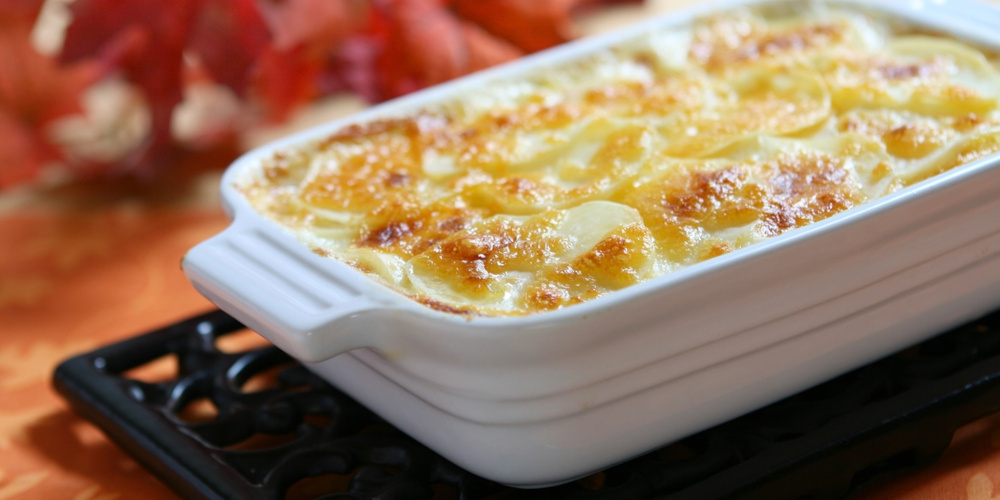 Για το ψήσιμο: Σε μακρόστενο πυρίμαχο σκεύος, λαδωμένο ή βουτυρωμένο, στρώνουμε τις μισές πατάτες κομμένες σε λεπτές φέτες. Πρέπει να μισοκαλύπτει η μία φέτα πατάτας την άλλη. Προσθέτουμε αλάτι και πιπέρι στις πατάτες.