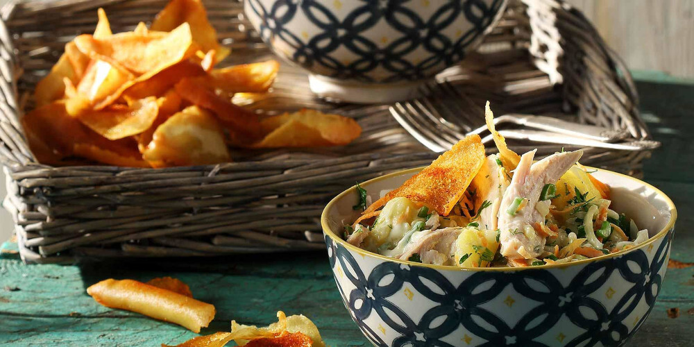 Bράζουμε τις πατάτες με την φλούδα να μαλακώσουν για την κοτοσαλάτα με πατάτες. Τις καθαρίζουμε και τις σπάμε με πιρούνι σε μπολ, να κάνουν αγριάδες με το σπάσιμο. Αυτό πρέπει να γίνει όσο οι πατάτες είναι ζεστές.