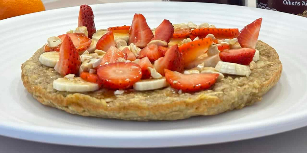Στη συνέχεια βάζουμε 1 κ.τ.σ ελαιόλαδο σε ένα αντικολλητικό τηγάνι και βάζουμε το μείγμα σε μέτρια φωτιά,σκεπάζουμε με ένα καπάκι και ψήνουμε για 12 λεπτά. Θα πρέπει όταν είναι έτοιμη να μην είναι καθόλου υγρή στο κέντρο. Βάζουμε σε μια πιατέλα και σερβίρουμε με φρούτα τις αρεσκείας μας.