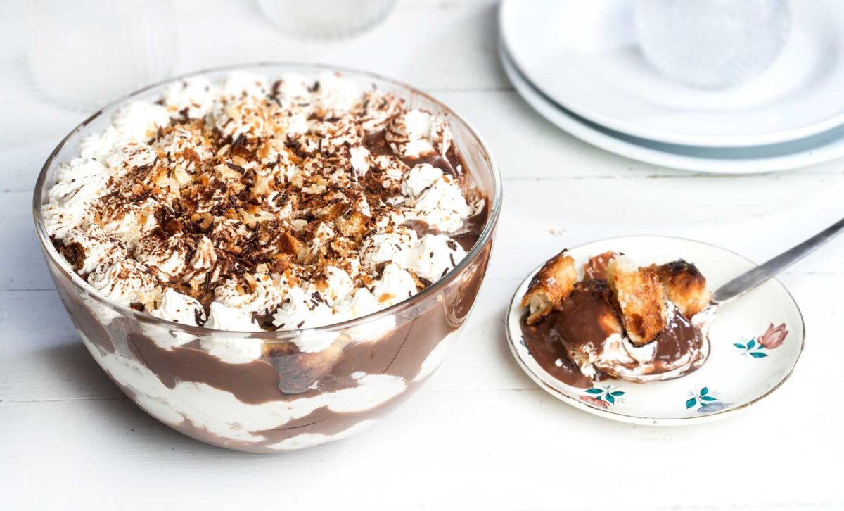 Για το στήσιμο γλυκού: Βάζουμε λίγη κρέμα σοκολάτας σε βαθύ γυάλινο μπολ. Κάνουμε ροζέτες με την χτυπημένη κρέμα και ακουμπάμε μια στρώση καραμελωμένες μπουκιές κρουασάν. Επαναλαμβάνουμε στρώσεις. Τελειώνουμε με παχιά στρώση κρέμα σοκολάτας και γαρνίρουμε με ροζέτες χτυπημένης κρέμας. Πασπαλίζουμε κακάο και τρίμμα σοκολάτας.