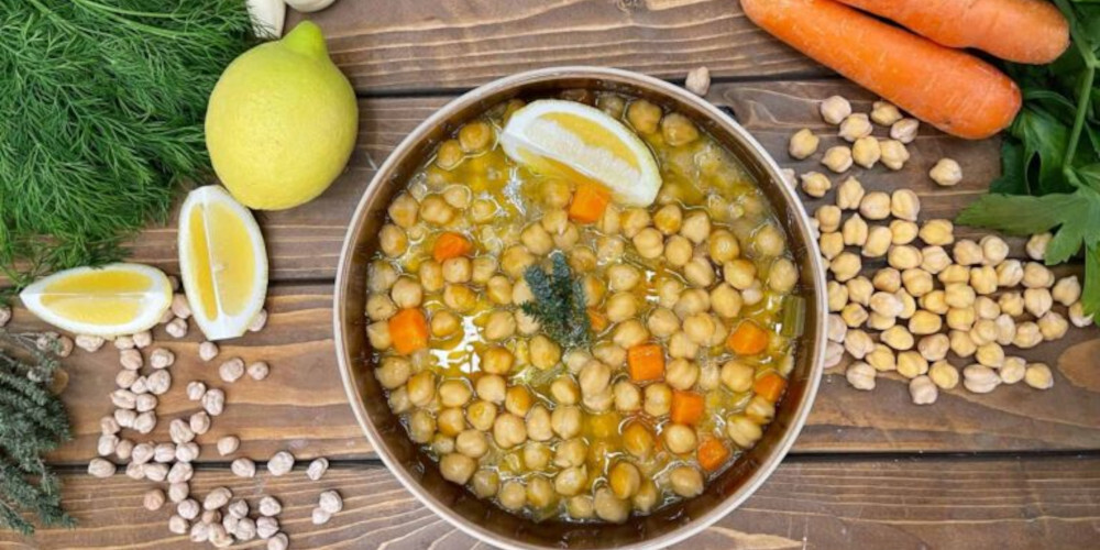 Κόβουμε τα λαχανικά μας, βάζουμε σε μια κατσαρόλα ελαιόλαδο και τα σοτάρουμε σε μέτρια φωτιά. Προσθέτουμε και το θυμάρι, το ξύσμα και τον χυμό από το λεμόνι. Τέλος προσθέτουμε το κύμινο και τα φύλλα δάφνης με τα ρεβύθια και τον κύβο λαχανικών. Προσθέτουμε περίπου 1 λίτρο νερό, πρέπει να σκεπαστούν τα ρεβύθια.
