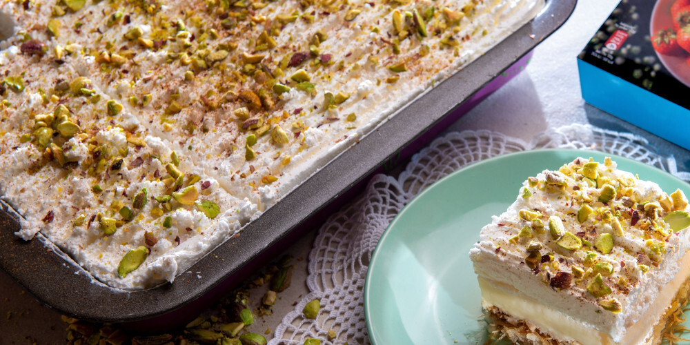 Αφού έχει βράσει το γάλα παίρνετε με κουτάλα και ρίχνετε μέσα στο μπολ ανακατεύοντας συνεχώς. Όταν θα έχετε ρίξει όλο το γάλα, ξανά επιστρέφετε με το μείγμα στην κατσαρόλα και βράζετε σε μέτρια θερμοκρασία ανακατεύοντας μέχρι να πήξει κρέμα. Τέλος αποσύρετε από τη φωτιά, ρίχνετε τις βανίλιες, την μαστίχα κοπανισμένη με μισό κουταλάκι του γλυκού ζάχαρη, το βούτυρο και ανακατεύετε μέχρι να λιώσει. Ρίχνετε την κρέμα πάνω από το κανταΐφι και απλώνετε ομοιόμορφα, σκεπάζετε με μεμβράνη και κρατάτε στην άκρη μέχρι να κρυώσει εντελώς. Ρίχνετε όλα τα υλικά για την σαντιγί και χτυπάτε στο μίξερ μέχρι να πήξει. Απλώνετε τη σαντιγί ομοιόμορφα πάνω στην κρέμα και περνάτε όλη την επιφάνεια με ένα πιρούνι ώστε να δημιουργήσετε σχήματα. Πασπαλίζετε με αρκετό θρυμματισμένο φιστίκι Αιγίνης και λίγη κανέλα. Αφήνετε στο ψυγείο για 3 ώρες μέχρι να παγώσει εντελώς και σερβίρετε.