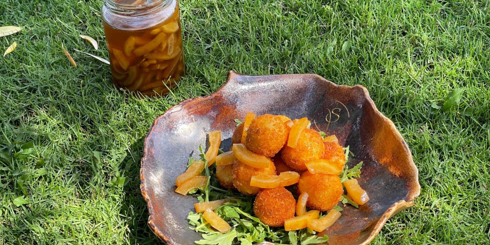 Τοποθετούμε τις μπάλες τυριού σε ένα δίσκο και τις βάζουμε ξανά στο ψυγείο Αλευρώνουμε τις μπάλες τυριού. Μετά τις βουτάμε στα χτυπημένα αυγά και τέλος της καλύπτουμε με την φρυγανιά. Προσθέτουμε περίπου 250 ml ηλιέλαιο σε ένα φαρδύ και βαθύ τηγάνι, σε μέτρια φωτιά. Όταν το λάδι ζεσταθεί, βάζουμε τις τυροκροκετες και τις τηγανίζουμε μέχρι να πάρουν ένα χρυσαφί χρώμα. Τις σερβίρουμε με γλυκό του κουταλιού κυδώνι.