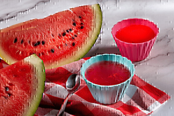 Αφού έχουμε καθαρίσει το καρπούζι από τα κουκούτσια, κόβουμε σε μικρά κομμάτια και μεταφέρουμε σε ένα πολυμηχάνημα.