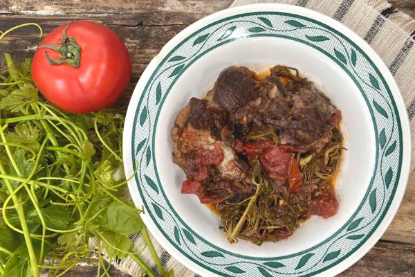 Προσθέτουμε τις ντομάτες κομμένες σε φέτες, το πελτέ και τους κάβους. Αφήνουμε να ψηθεί για μίση ώρα.Κατεβάζουμε από τη φωτιά, ρίχνουμε πιπέρι και αφήνουμε για 10 λεπτά να μελώσει πριν σερβίρουμε.