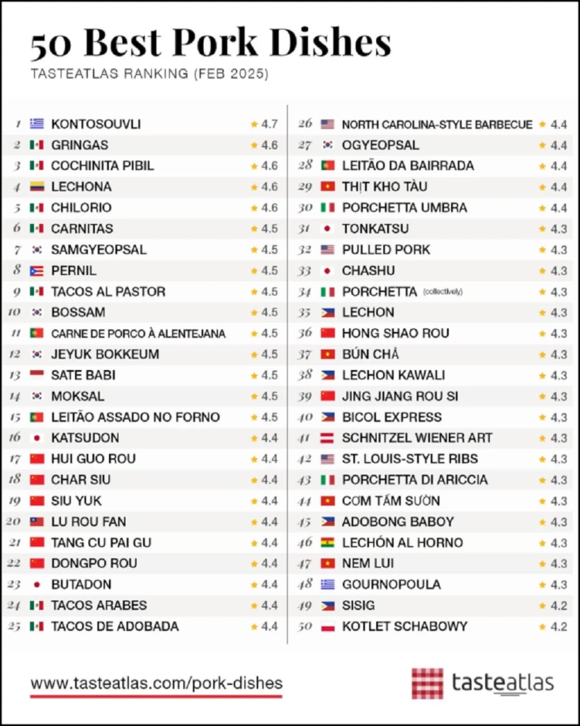 Ωστόσο αυτή δεν είναι η μόνη ελληνική θέση και γεύση στη λίστα αφού στη θέση 48 φιγουράρει και η γουρουνοπούλα, μια κλασική επιλογή στη νότια Ελλάδα, με το χοιρινό να ψήνεται ολόκληρο και να αποκτά τραγανή πέτσα.