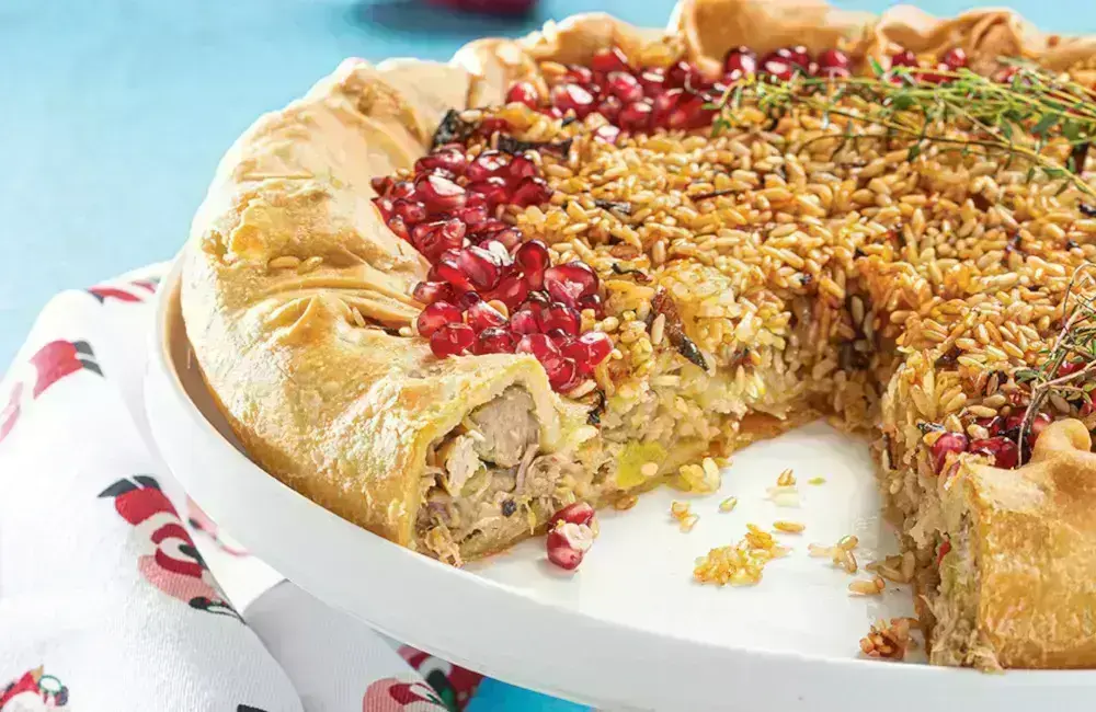 Αδειάζω στο κέντρο το ρύζι. Ζεσταίνω τον ζωμό κρέατος που έχει απομείνει και ρίχνω 2 φλιτζάνια στο κέντρο που βρίσκεται το ρύζι. Μεταφέρω το ταψί στο φούρνο και ψήνω την πίτα για 1 ώρα.