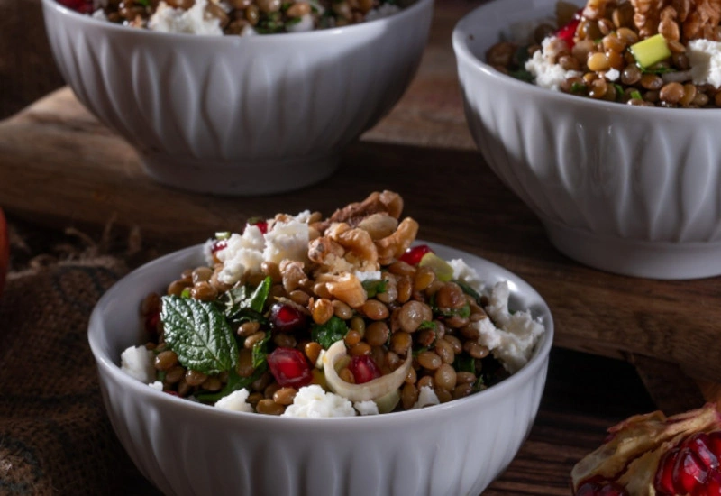 Σε μπολ βάζουμε τις φακές, τα κρεμμυδάκια, το ρόδι και τα καρύδια. Προσθέτουμε το δυόσμο, το μαϊντανό και ρίχνουμε τη φέτα θρυμματισμένη.