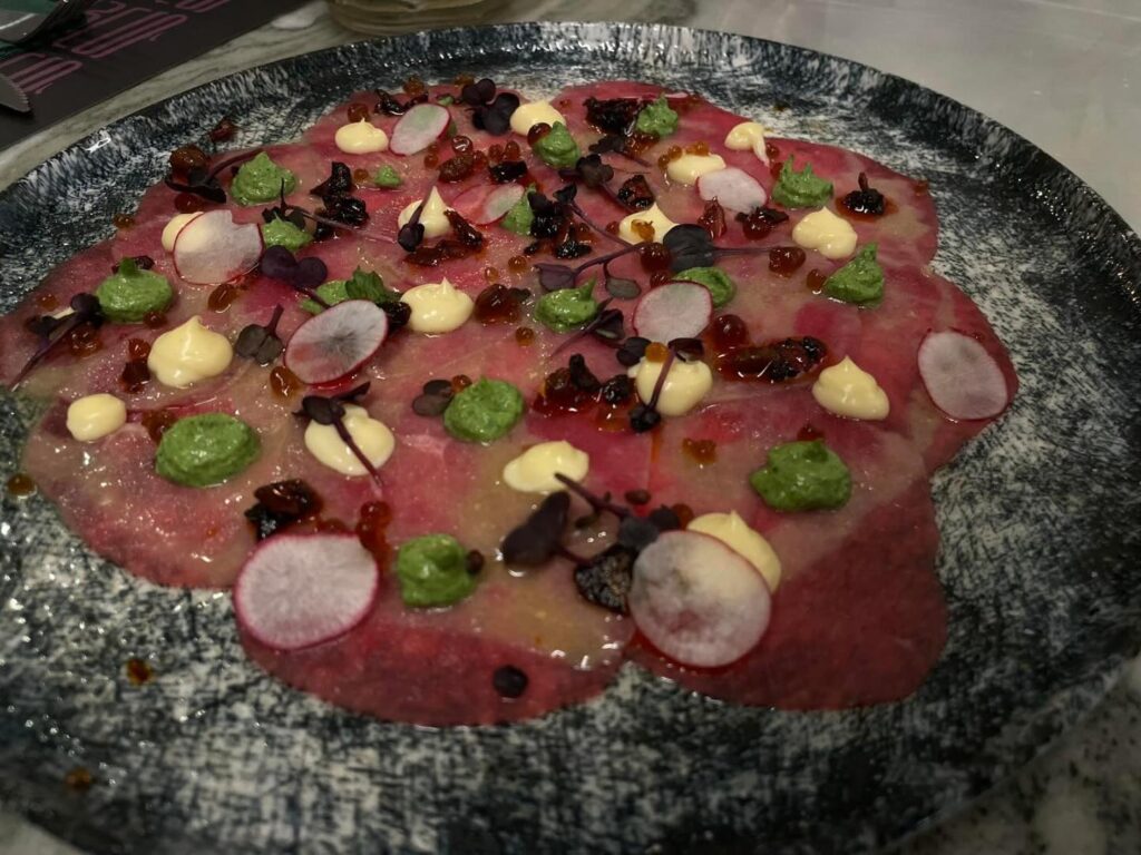 Για τους λάτρεις του κρέατος, το καρπάτσιο με κρέμα ρόκας, παλαιωμένη γραβιέρα Κρήτης, πέρλες βαλσάμικου, αλλά και το αρνάκι σε αμπελόφυλλα με πιπεριά Φλωρίνης, κουσκούς, κολοκύθι και κουνουπίδι, είναι όνειρο.