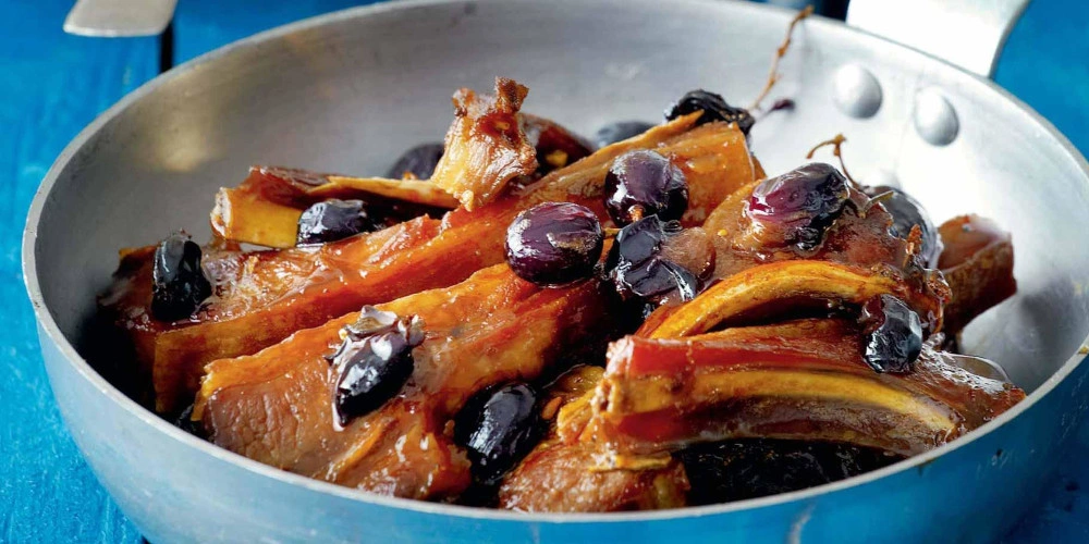 - Σερβίρουμε τα παϊδάκια σε πιατέλα και περιχύνουμε με τη σάλτσα σταφυλιών.