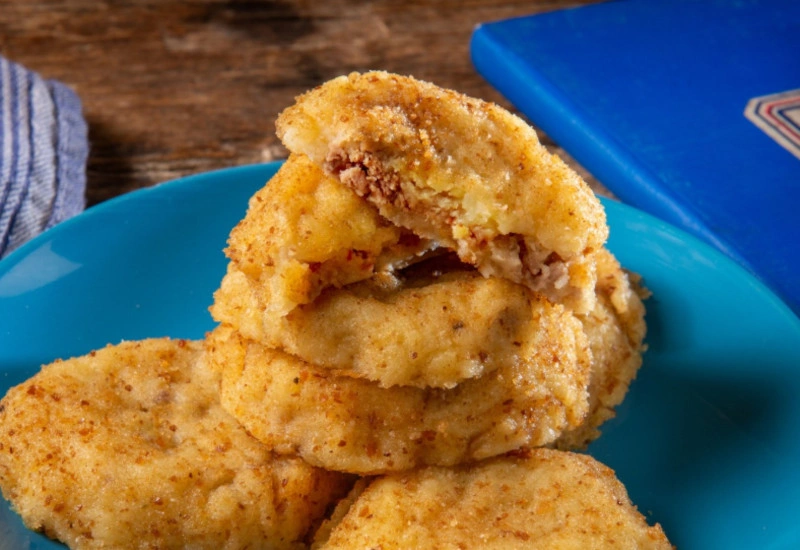 Παίρνουμε μια ποσότητα από το μείγμα και ανοίγουμε στο χέρι μας, τοποθετούμε στη μέση ένα κουταλάκι κιμά και κλείνουμε, πλάθουμε σε μπάλα και πιέζουμε απαλά, επαναλαμβάνουμε με τα υπόλοιπα.Σε ένα πιάτο αδειάζουμε την φρυγανιά και πασπαλίζουμε τους πατατοκεφτέδες, μεταφέρουμε σε έναν δίσκο και αφήνουμε στο ψυγείο για μια ώρα.