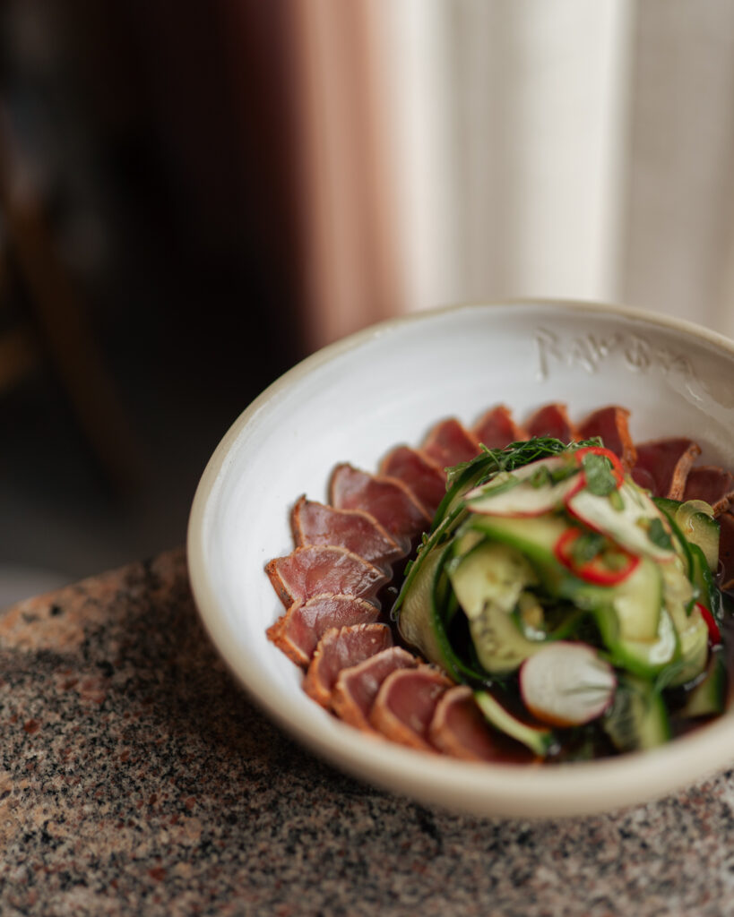 Στο RawBata -που κλείνει ήδη τον πρώτο χρόνο του- μπερδεύει νόστιμα τα φασολάκια στη σχάρα (στην ιαπωνική σχάρα ρομπάτα, που δάνεισε και το όνομα της στο εστιατόριο) με τόνο τατάκι, τραχανά με κατσικάκι ή κόκορα με χυλοπίτες. Αξιοποιώντας δημιουργικά τις τεχνικές της ιαπωνικής κουζίνας, που άριστα κατέχει, με τις εποχιακές πρώτες ύλες που καθημερινά αναζητά στις λαϊκές η απευθείας από τους παραγωγούς.