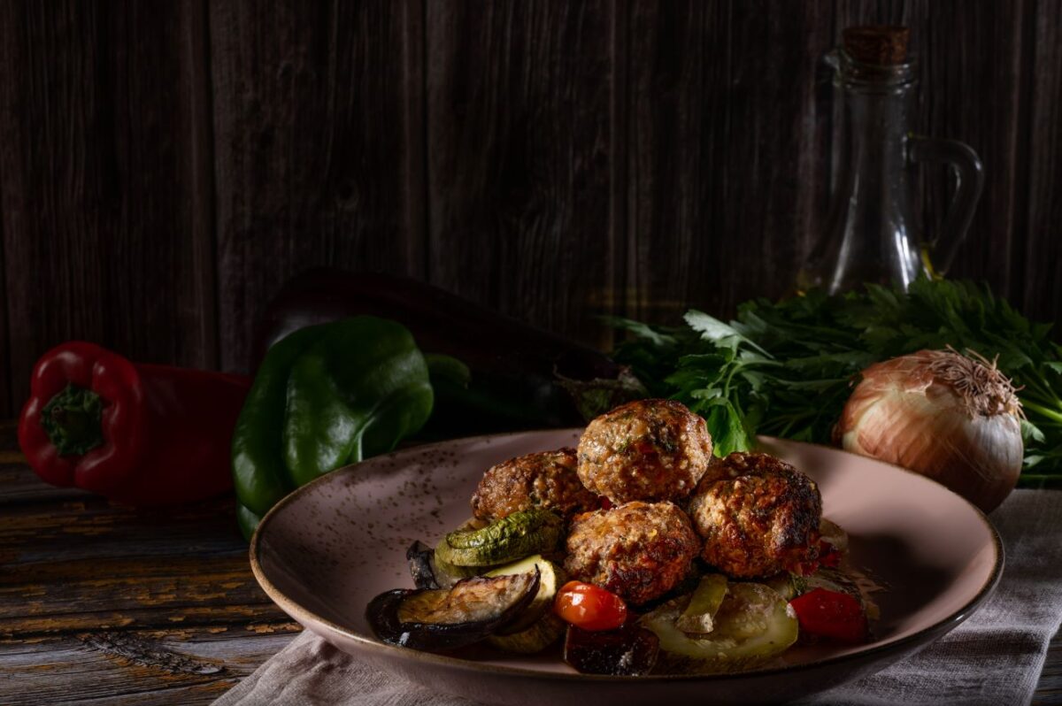 Ψήνουμε σε προθερμασμένο φούρνο στους 180 βαθμούς στις αντιστάσεις για περίπου 1 ώρα. Τα τελευταία 15 λεπτά ξεσκεπάζουμε το ταψί και συνεχίζουμε το μαγείρεμα μέχρι να πάρει χρώμα. Αφού είναι έτοιμο, σερβίρουμε τα κεφτεδάκια με τα λαχανικά.