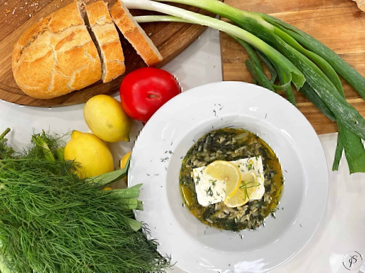 Κλείνουμε τη φωτιά και προσθέτουμε το πράσινο μέρος από το φρέσκο κρεμμύδι, τον άνηθο, λίγο ελαιόλαδο, λεμόνι και ξυπνά από λεμόνι.
