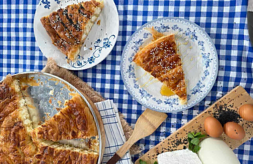 Βουτυρώνουμε όλα τα φύλλα. Σε ένα μπολάκι χτυπάω το αυγό με το γιαούρτι και ψήνουμε την πίτα για 50-60 λεπτά. Όταν είναι έτοιμη τη βγάζουμε (πασπαλίζουμε αν θελουμε με λευκό και μαυρο σουσάμι) από το φούρνο, την αφήνουμε για λίγο να κάτσει και σερβίρουμε.