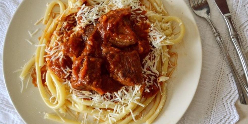 Παράλληλα, σε μια άλλη κατσαρόλα, βράζετε τα μακαρόνια σε αλατισμένο νερό. Δοκιμάζετε με ένα πιρούνι, αν το μοσχάρι είναι έτοιμο.