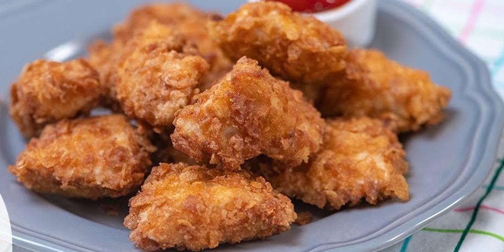 Κόβετε το στήθος κοτόπουλο σε μπουκιές μεσαίου μεγέθους. Το αλατίζετε καλά. Περνάτε μια μια τις μπουκιές κοτόπουλο από το αλεύρι και στη συνέχεια στο διάλυμα αυγού. Το περνάτε από τα δημητριακά μέχρι να επικαλυφθεί από όλες τις πλευρές.