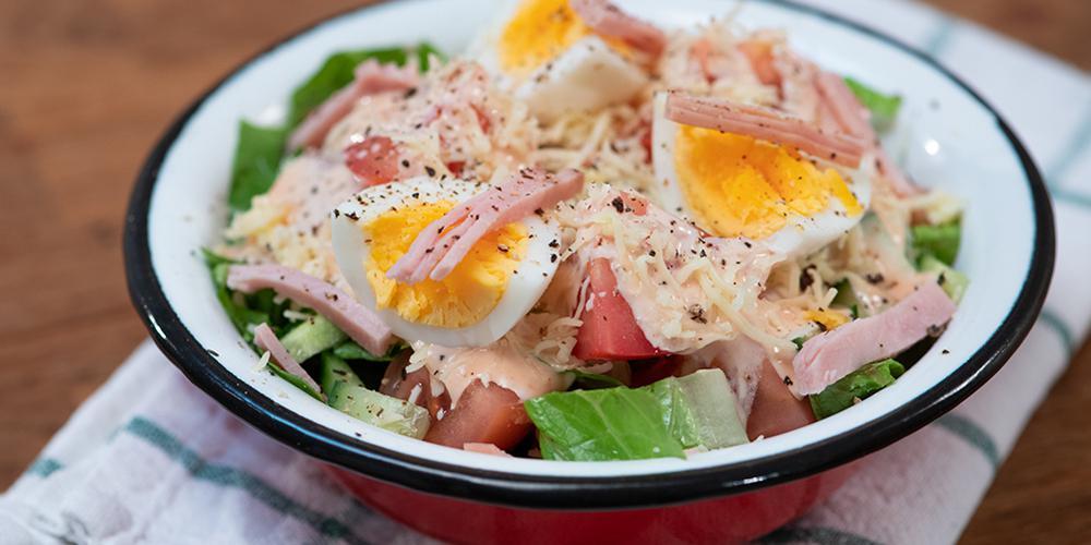 Γαρνίρετε τη σαλάτα με το βρασμένο αυγό, που το κόβετε σε τέταρτα. Τέλος, προσθέτετε στη σαλάτα ψιλοκομμένο ζαμπόν.