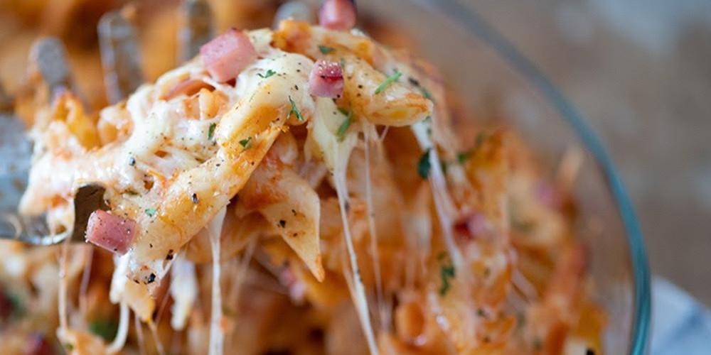 Όσο βράζει η σάλτσα, σε κατσαρόλα με άφθονο νερό βράζετε τα ζυμαρικά al dente για 6 λεπτά. Σε μπολ αναμειγνύετε τη σάλτσα με τα ζυμαρικά. Σε πυρίμαχο σκεύος, ρίχνετε τη μισή ποσότητα από το μείγμα ζυμαρικών. Πασπαλίζετε με τη μισή ποσότητα από την τριμμένη γραβιέρα. Προσθέτετε τη χοιρινή μπριζόλα. Ρίχνετε τα υπόλοιπα ζυμαρικά και πασπαλίζετε με τα υπόλοιπα τυριά. Ψήνετε για 20-25 λεπτά, μέχρι να λιώσει το τυρί και να σχηματίσει κρούστα.