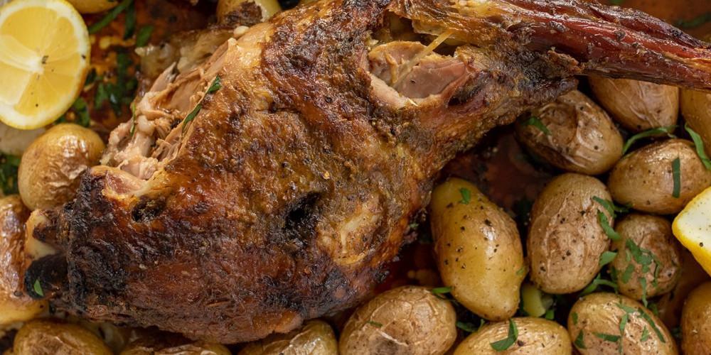 Τοποθετείτε το αρνί πάνω από τις πατάτες και το σκεπάζετε με αλουμινόχαρτο. Ψήνετε σε προθερμασμένο φούρνο στους 120°C, για περίπου 5-6 ώρες, ανάλογα με το μέγεθος του κομματιού που μαγειρεύετε, μέχρι να μαλακώσει το κρέας και να πάρει ωραίο χρώμα.