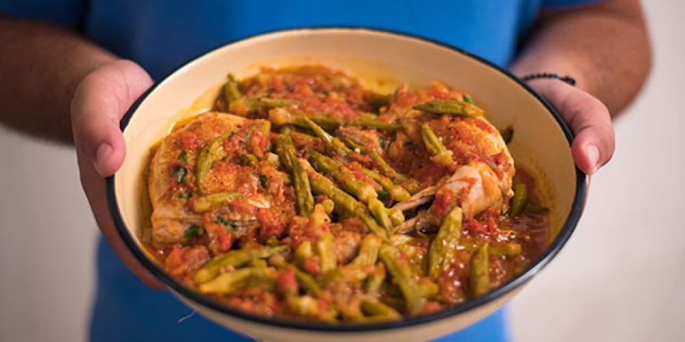 Αφαιρείτε το περίβλημα του κοτσανιού από τις μπάμιες. Τις βάζετε σε μπολ με το ξύδι και αφήνετε να μαριναριστούν για 10 λεπτά. Αλατοπιπερώνετε καλά το κοτόπουλο.