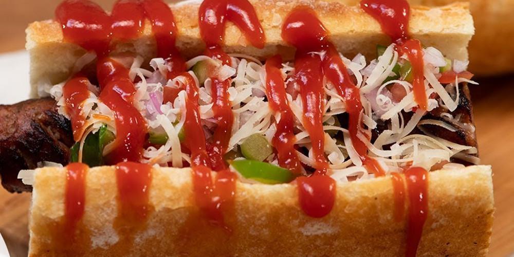 Κόβετε μια γαλλική μπαγκέτα στη μέση και στη συνέχεια τη χαράζετε κατά μήκος. Απλώνετε τη σάλτσα καυτερής πιπεριάς στη μπαγκέτα. Γεμίζετε το χοτ ντογκ με το σοταρισμένο κρεμμύδι και τις πιπεριές, το χωριάτικο λουκάνικο, φρέσκια ντομάτα, φρέσκια πιπεριά, κρεμμύδι και τριμμένο κίτρινο τυρί της επιλογής σας.