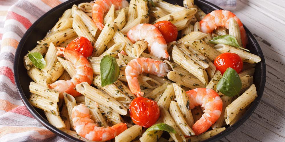 Ανακατεύετε τα ζυμαρικά με τις πιπεριές, προσθέτετε από πάνω τις γαρίδες και περιχύνετε τη σαλάτα με όλο το μίγμα λεμονιού. Τρίβετε λίγο φρέσκο μαϊντανό και η σαλάτα σας είναι έτοιμη.